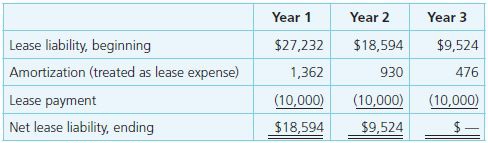 Per the details of our scenario above, an operating lease is present. A total of $30,000 consideration is given over three years, $10,000 in each year. The present value of the consideration (assumed discount rate of 5%) totals $27,232.