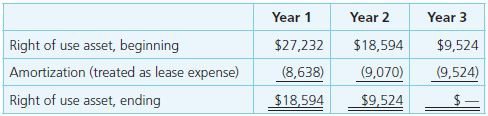 Per the details of our scenario above, an operating lease is present. A total of $30,000 consideration is given over three years, $10,000 in each year. The present value of the consideration (assumed discount rate of 5%) totals $27,232.