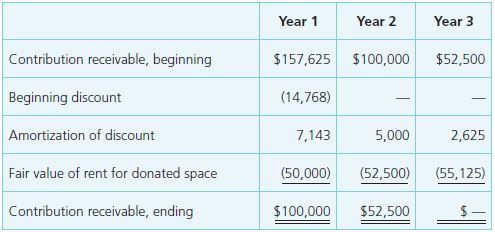 In year one, the client will record a contribution receivable and contribution revenue in the amount of the present value of the future rent of $142,857. The client would then record rent expense and a reduction of the receivable in the amount of $50,000. They would also recognize the amortization of the time value discount of $7,143. Years two and three would be handled similarly, adjusting the amounts for the increase in the fair value of rent.