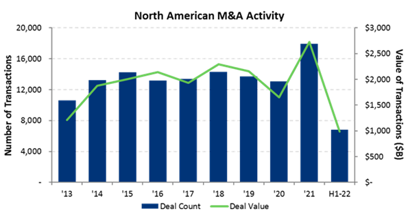Activity in H1-2022 is up when compared to the average of the last M&A cycle, despite challenging conditions. Buyers and sellers have become more cautious due to uncertainty surrounding global economic factors such as: rising inflation and borrowing rates, volatility in commodity costs, world-wide supply chain shortages, and geopolitical tension. Despite the uncertainty and caution from buyers and sellers, the M&A market should not be interpreted as weak.