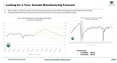 Data from Armada Corporate Intelligence forecasts a surge in manufacturing through Q2 of 2024 and more of a softening of that production through the end of 2024. The lull will stop short of a recession, but demand will cool off.