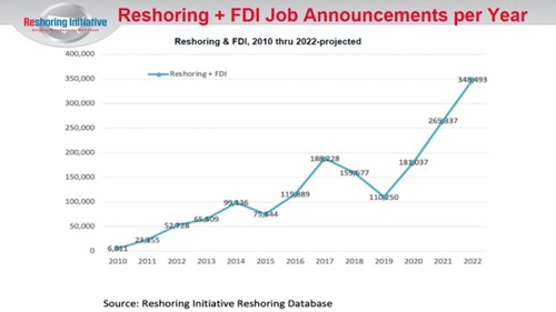Bringing manufacturing back to the U.S. has been a common theme over the last three to five years. From 2017 under the Trump administration to today under President Biden, legislation and policy have been geared toward improving domestic manufacturing and production. Since 2010, reshoring and FDI job announcements have gone from 6,000 annually to nearly 350,000.
