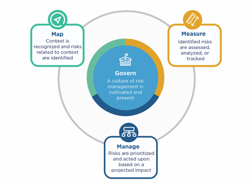 The AI RMF is made up of four key components: Govern, Map, Measure, and Manage. Each component contains sub-categories that provide further context and will help you understand how different elements apply to your organization. Together, these elements can help guide your AI development, ensure compliance, and foster the responsible innovation and application of AI systems.