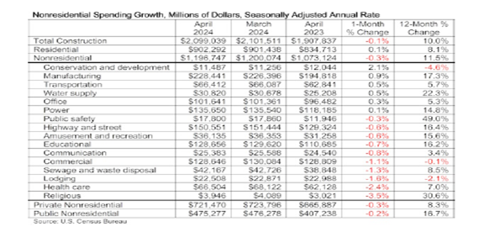 The private sector reported a 0.2 percent decline in March and then a 0.3 percent decline in April after having several months of continued growth. With a consecutive two-month private sector the seasonally adjusted annual rate of spending to 1.2 trillion dollars, according to Associated Builders and Contractors’ analysis of U.S. Census Bureau data.